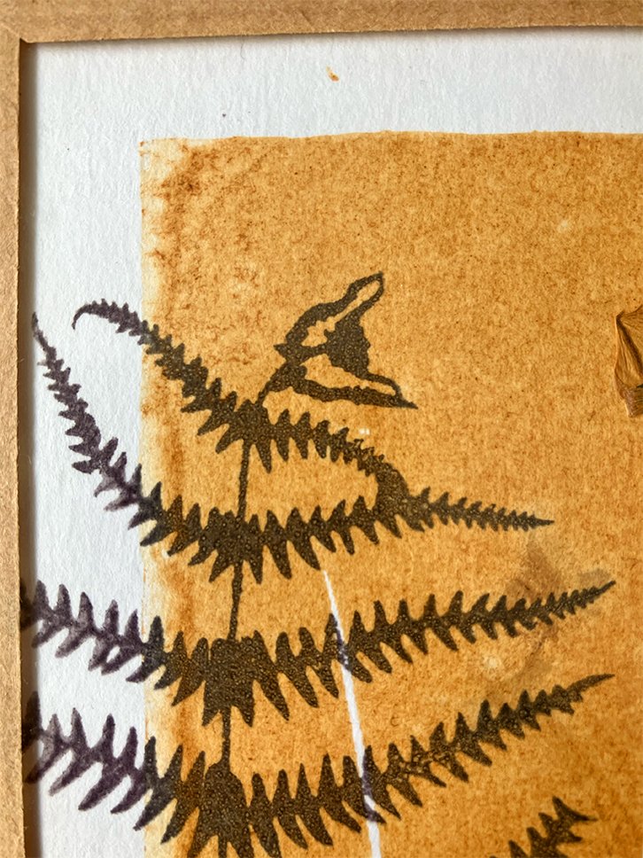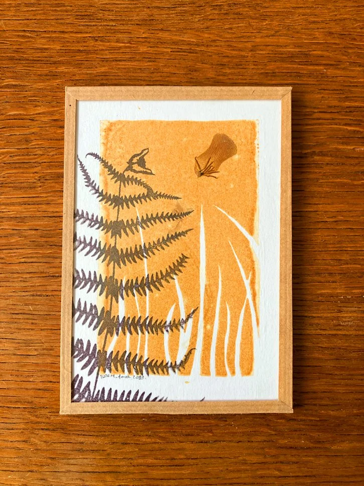 Ce tableau comprend une empreinte de végétal, plusieurs passages d’impression en sérigraphie.