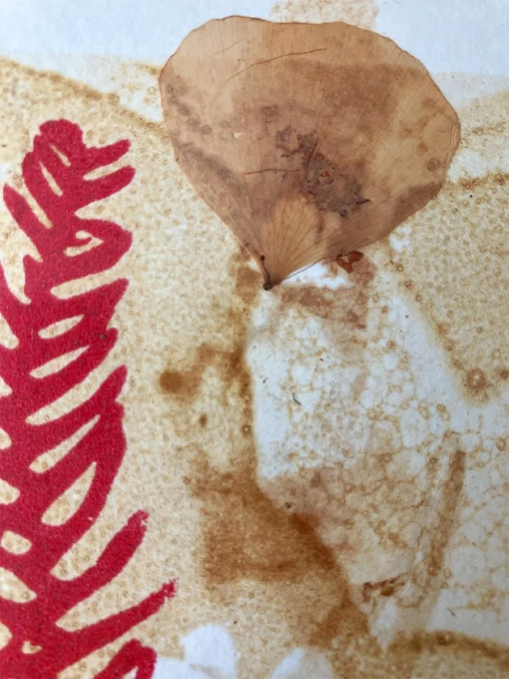 Ce tableau comprend une empreinte de végétal, plusieurs passages d’impression en sérigraphie.
